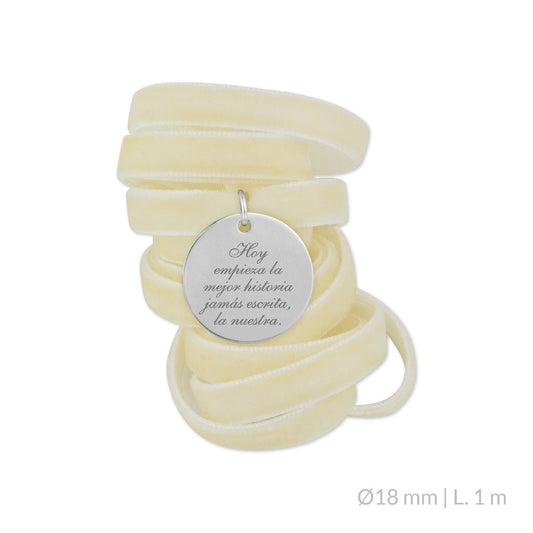 La medalla para ramo de novia es un accesorio delicado que se coloca entre las flores del ramo mediante un lazo o cinta decorativa. Suelen estar grabadas con: