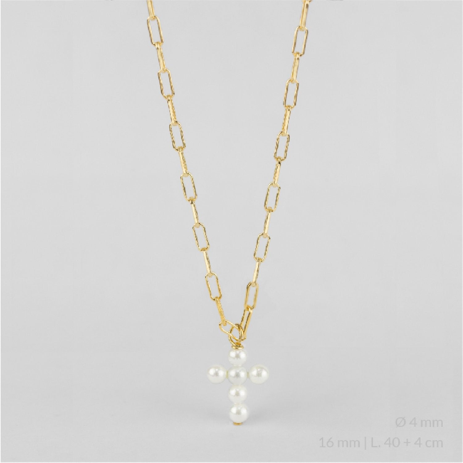 Su diseño moderno incorpora una cadena de eslabones rectangulares y un colgante en forma de cruz de perlas, símbolo de elegancia y pureza. Perfecto para realzar cualquier estilo, desde un look casual hasta una ocasión especial.