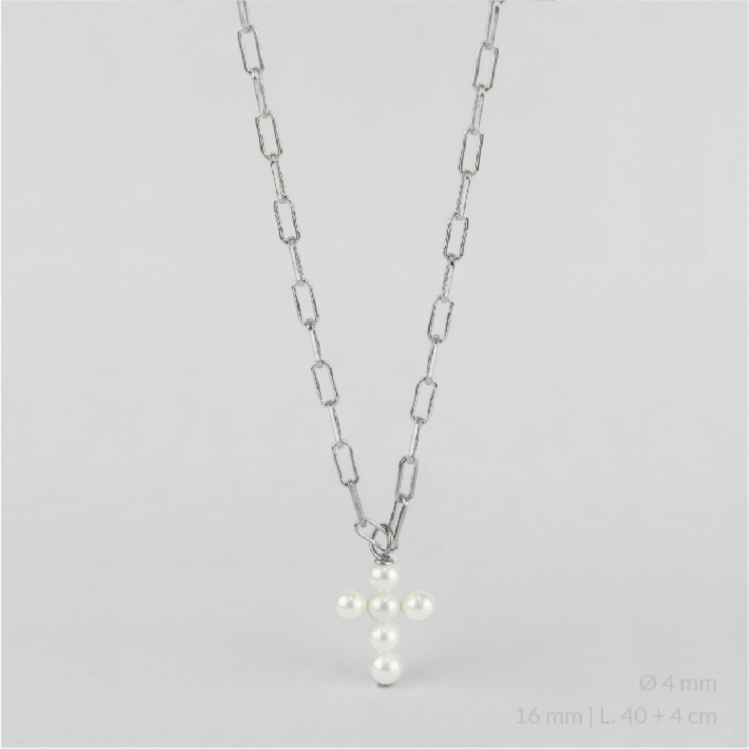 Su diseño moderno incorpora una cadena de eslabones rectangulares y un colgante en forma de cruz de perlas, símbolo de elegancia y pureza. Perfecto para realzar cualquier estilo, desde un look casual hasta una ocasión especial.