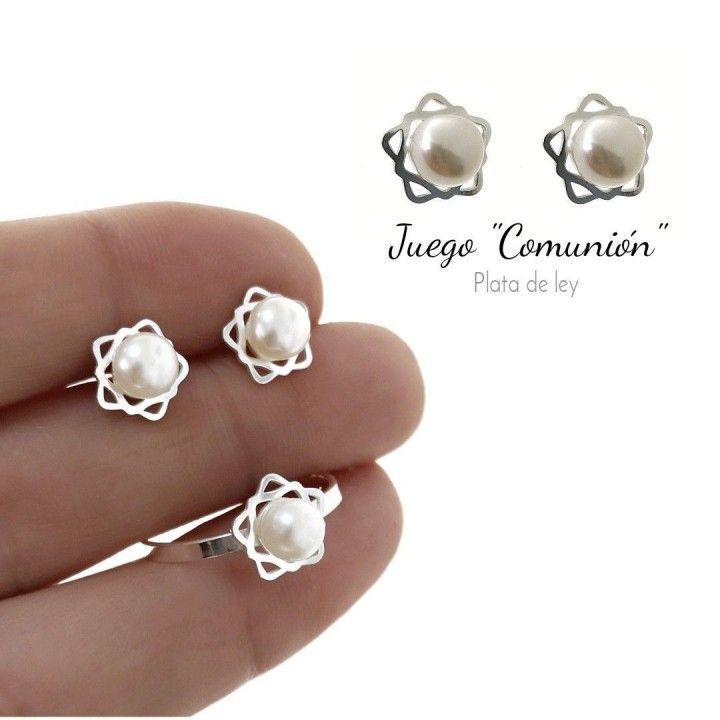 Juego de pendientes en presión y sortija plata de ley 925 estrella con perla de botón en 5mm .