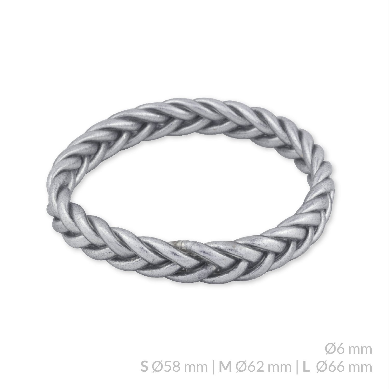 Pulsera trenzada simple de plástico con pan de Oro en su interior. Grosor total: Ø11 mm. Color: plateado.