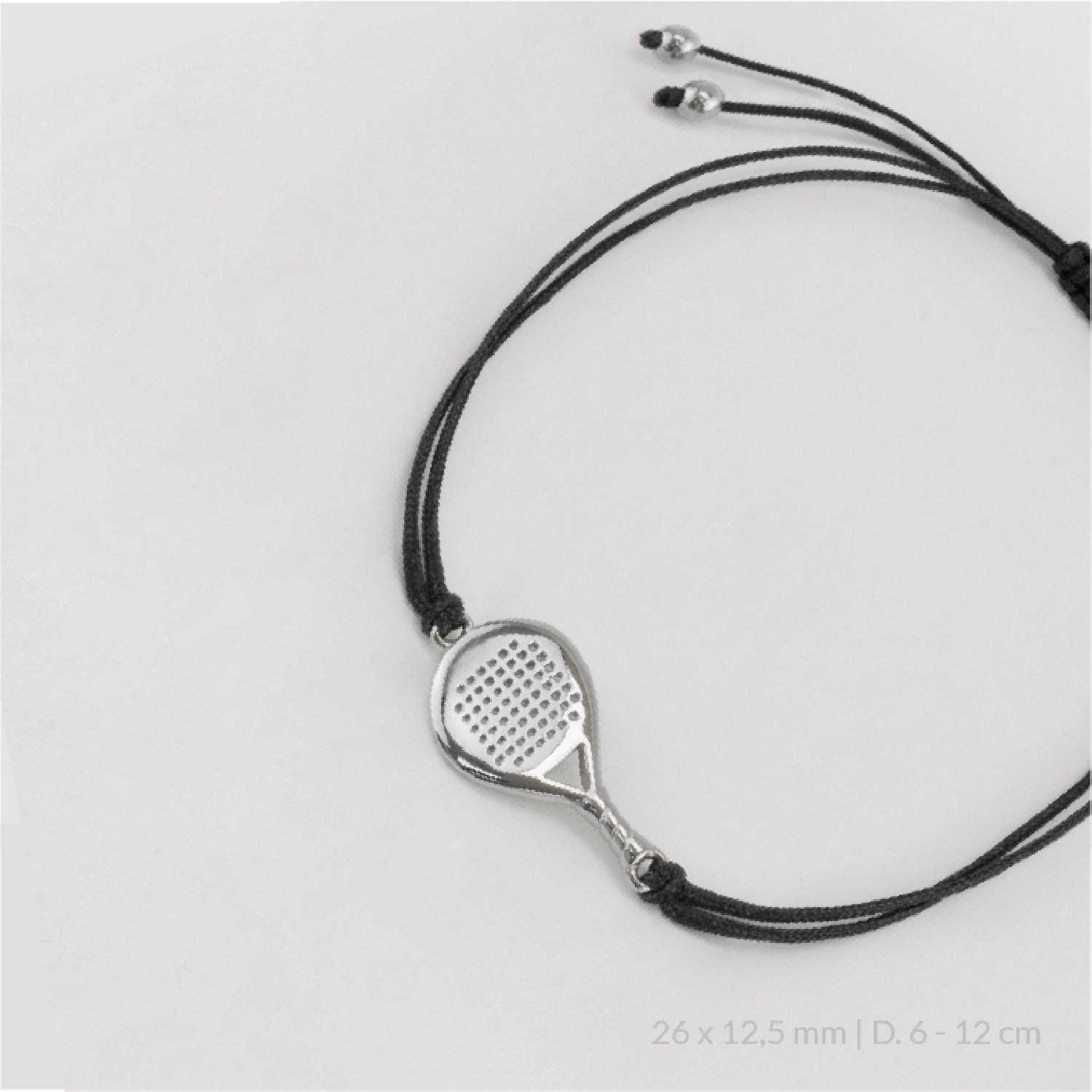Pulsera unisex con una pala de pádel con hilo de nylon negro muy resistente y duradero. Con medida universal, totalmente ajustable para cualquier muñeca.